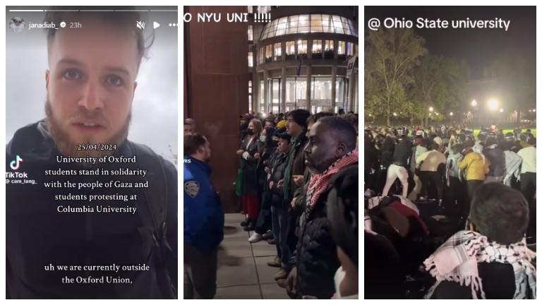 ومن ضمن هذه الفيديوهات مظاهرة عدد من طلاب جامعة نيويورك الأمريكية الذين اصطفوا أمام قوات الشرطة إلى جانب فيديو آخر لطالب من جامعة أوكسفورد وهو يعلن تضامنه مع الشعب الفلسطيني وتظاهره خارج الجامعة، وفيديو آخر لتظاهرات طلاب جامعة أوهايو وسط مشادات بينهم وبين قوات الأمن.