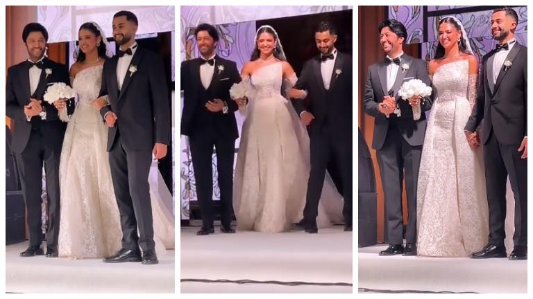 وكانت ظهرت “ليلى” وهي بفستان الزفاف من غرفتها قبل دقائق من النزول للقاعة وبجانبها والدها الفنان سامح يسري الذي لم يرافقها طيلة الوقت.
