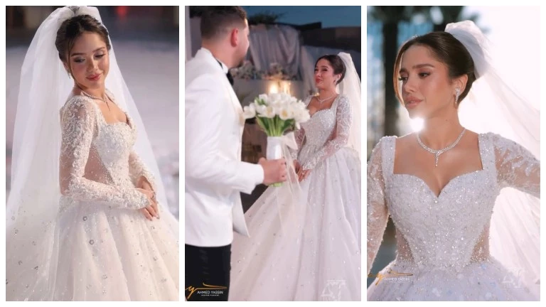 “قبلة على الخد”.. جلسة تصوير رومانسية في حفل زفاف رنا رئيس