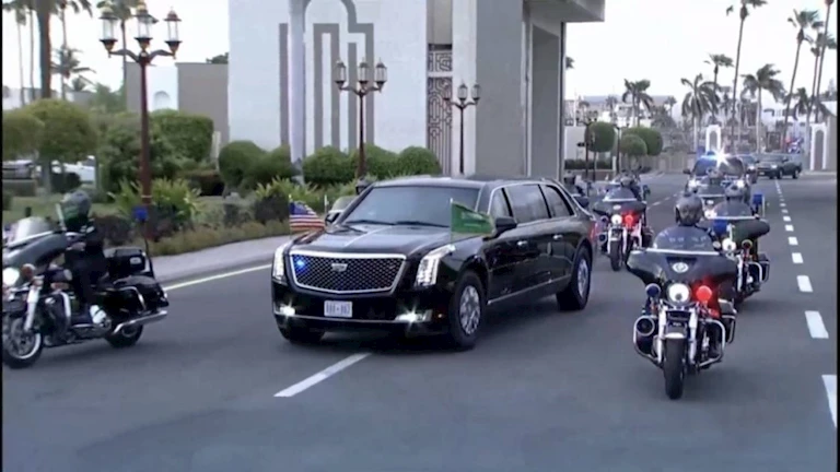 وكعادة رؤساء الولايات المتحدة الأمريكية، يصطحب ترامب خلال زيارته إلى دول الخليج السيارة الرئاسية المصفحة “The cadillac one” والتي يطلق عليها اسم السيارة “الوحش”.