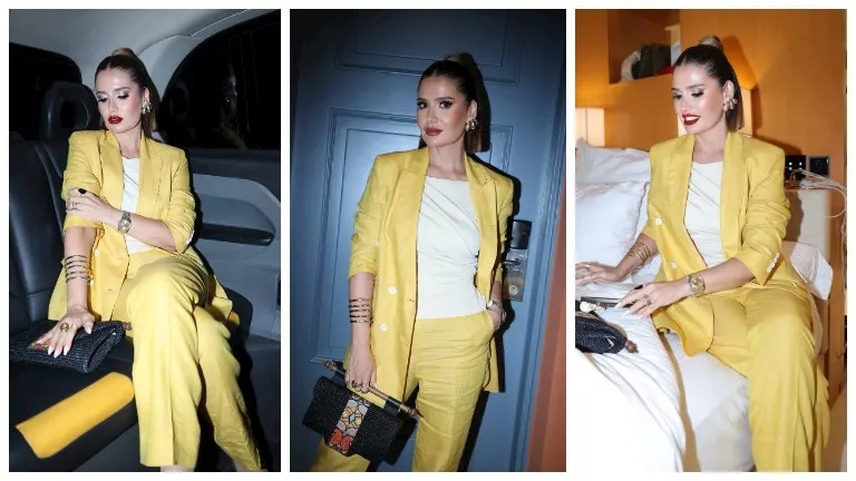 تألقت الفنانة هنا شيحة بإطلالة أنيقة من خلال أحدث ظهور لها، حيث ارتدت بدلة باللون الأصفر الزاهي، ونسقتها مع توب أبيض.