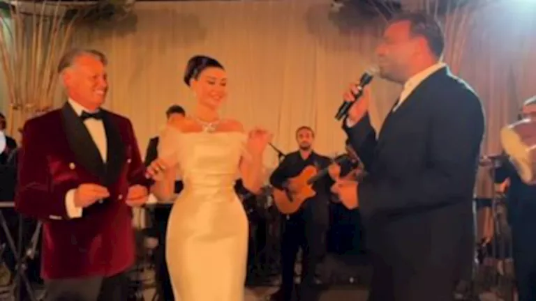 وظهر بالفيديو لحظة حضور رامي صبري حفل الزفاف واستقبال أروى له، واحيائه لحفل زفافها.
