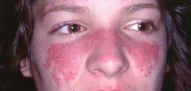 – طفح جلدي على شكل فراشة على الوجه يغطي الخدين والأنف.