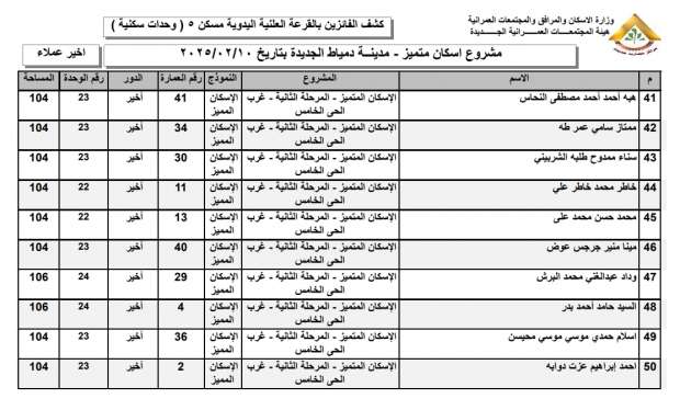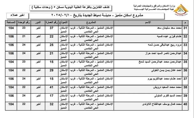 وخلال السطور التالية، نستعرض أسماء الفائزين بالقرعة العلنية على وحدات الإسكان المتميز 2025، في مدينة دمياط الجديدة: