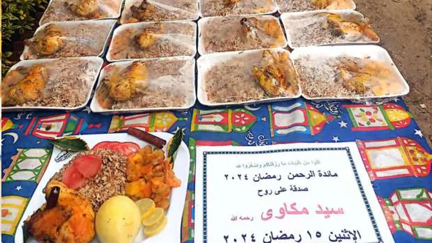 مائدة طويلة تحتوى على وجبات طعام تم تجهيزها استعداداً لإفطار عدد كبير من الصائمين، بنية الدعاء للفنان الراحل سيد مكاوى، هى فكرة فتحى المزين، رئيس مجلس أمناء مؤسسة خيرية بكفر الشيخ، إذ أراد التعبير عن حبه له، من خلال عمله.