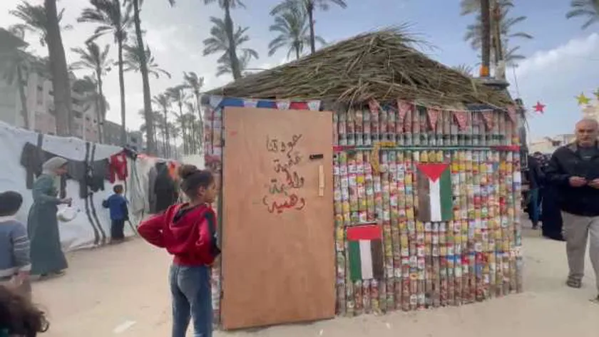 مجموعة من علب المعلبات الفارغة، متراصة إلى جوار بعضها البعض بشكل هندسي لافت، جرى تصميمها لتصبح خيمة لاستقبال واستضافة النازحين من شمال غزة القادمين إلى وسط القطاع، وتحديدا في مخيم «دير البلح»، مرفوع عليها علم فلسطين، ومكتوب على جوانبها عبارات تعبر عن معاناة الشعب الفلسطيني، منذ بدء عدوان جيش الاحتلال الإسرائيلي في السابع من أكتوبر الماضي، وبعض الكلمات التي تحمل رسالة رمزية ومؤثرة إلى العالم، بحسب المهندس عبدالله ثابت، مصمم الخيمة غير التقليدية لإيواء النازحين الفلسطينيين.