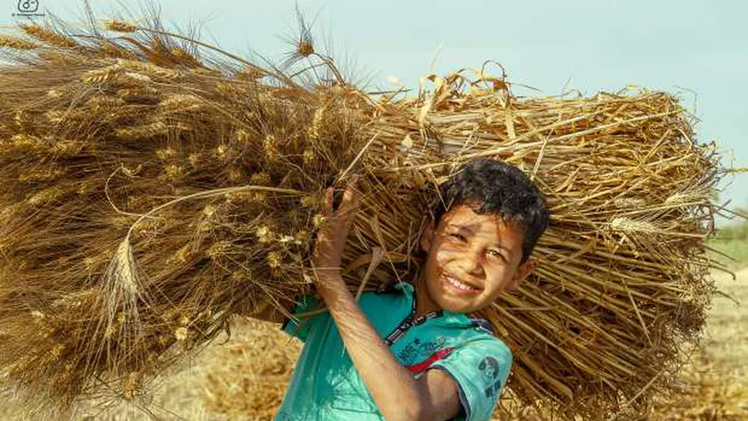 يرتدى «الشال» الأبيض وملابسه الزرقاء، حاملاً «كومة الغلّة»، على ظهره تتعالى ضحكاته فرحاً بمشاركته فى حصاد سنابل الذهب الأصفر، هو الطفل عبدالله محمود، البالغ من العمر 10 أعوام: «فرحان إنى نزلت الغيط مع أبويا ولمينا الغلّة، بروح الغيط من وقت ما كان عمرى 3 سنين، لما بكون جزء من عملية حصاد محصول ببقى فرحان، بحس إنى عملت حاجة كويسة، وإنى باكل من إيدى».