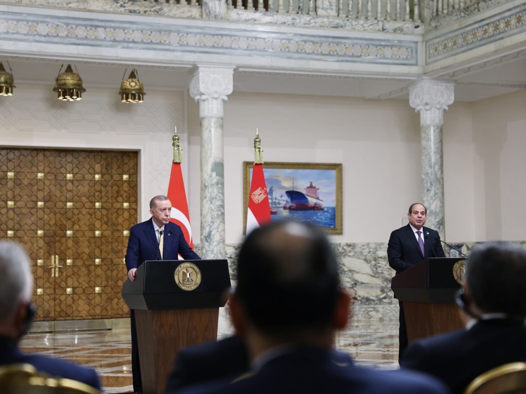 عقد الرئيس التركي رجب طيب أردوغان قمة مع نظيره المصري عبد الفتاح السيسي في القاهرة، عقب زيارة مماثلة للمملكة العربية السعودية. أكد الجانبان المصري والتركي تطابق الرؤى حول العديد من القضايا الإقليمية، بما في ذلك الوضع في فلسطين، وأعربا عن رغبتهما في تعزيز التعاون الثنائي في مختلف المجالات، بما فيها المجالات العسكرية والأمنية. هذه الخطوات تعكس رغبة مشتركة في إعادة هيكلة العلاقات الإقليمية.