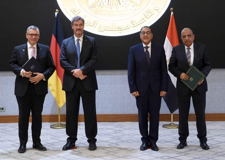 شهد رئيس مجلس الوزراء الدكتور مصطفي مدبولي، اليوم الخميس، و ماركوس زودر، رئيس وزراء ولاية بافاريا الألمانية، بمقر الحكومة بالعاصمة الإدارية الجديدة، مراسم توقيع إعلان نوايا مشترك بين وزارة الكهرباء والطاقة المتجددة، وحكومة ولاية بافاريا الألمانية، بشأن تعزيز التعاون الثنائي في مجال الهيدروجين.