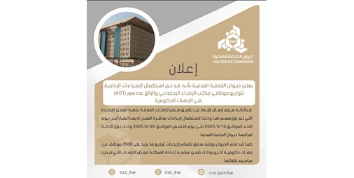 ديوان الخدمة استكمال إجراءات توزيع موظفي مكتب الإنماء الاجتماعي وعددهم 601 على الجهات الحكومية وإبلاغهم عبر سهل لاستكمال اجراءات مباشرة العمل اعتبارا من 16 الجاري حتى 20 منه