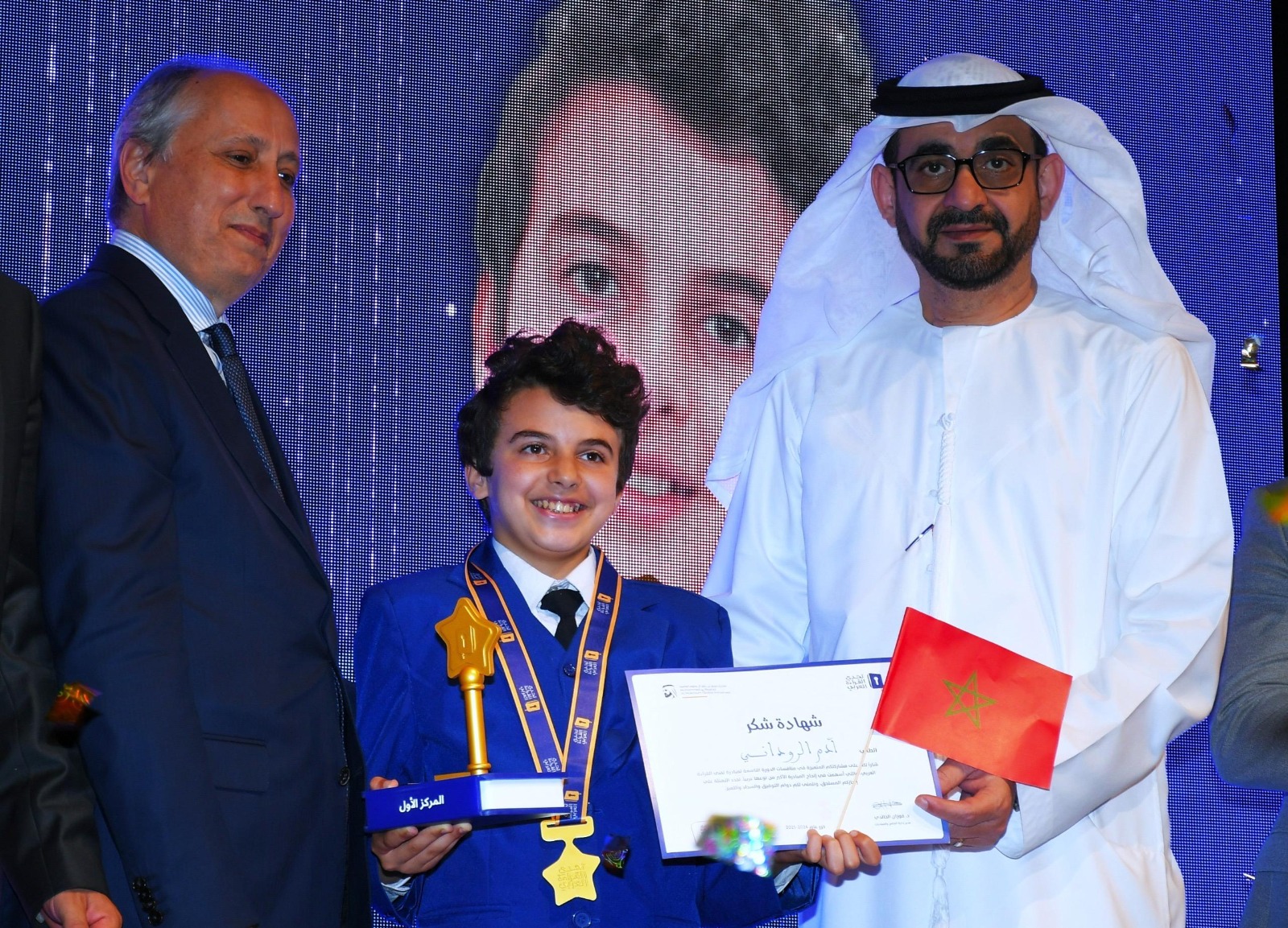 وجرى تتويج الطالب آدم الروداني من الصف الثامن في مدرسة الإمام الشافعي التابعة لمنطقة الرباط سلا القنيطرة خلال الحفل الختامي الذي جرى في العاصمة المغربية الرباط، بحضور معالي محمد سعد برادة وزير التربية الوطنية والتعليم الأولي والرياضة في المملكة المغربية، ومشاركة الدكتور فوزان الخالدي، مدير إدارة البرامج والمبادرات في مؤسسة “مبادرات محمد بن راشد آل مكتوم العالمية”، ومسؤولين وتربويين ومعنيين بالشأن الثقافي وعدد كبير من ذوي الطلبة المشاركين في المنافسات.