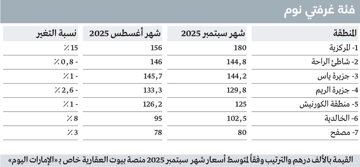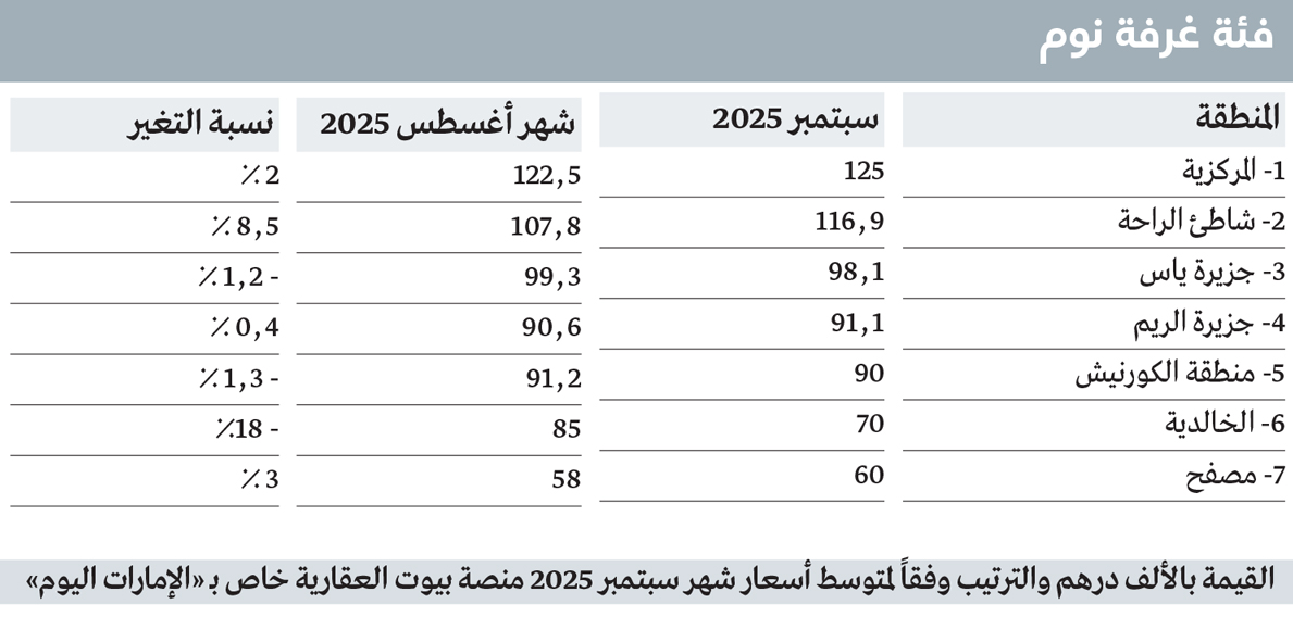 وفي فئة غرفة النوم، سجلت منطقة «المركزية» أعلى متوسط سعر للإيجار في أبوظبي خلال سبتمبر 2025، وذلك وفقاً لبيانات منصة «بيوت».