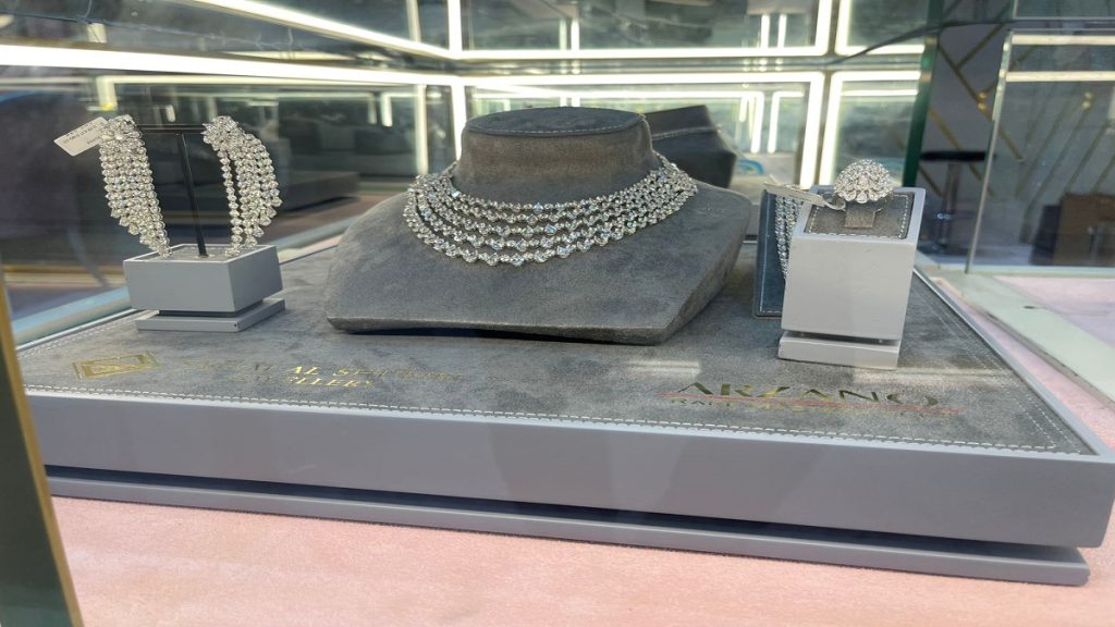 وأضاف عن الطقم الذي خطف الأنظار: «الطقم يتكون من أحجار متوالية من الألماس على شكلي الكمثرى والدائرة، وهذه النوعية من الأطقم تتمتع بدرجة نقاء كبيرة، ويباع المنتج بشهادة الجودة، ويتحدد سعر طقم الألماس بناءً على عدد الأقرطة ودرجة النقاء ونوعية الألماس والمعدن الذي يتم تركيب الألماس عليه ويختلف سعر البلاتينيوم عن الذهب عيار 18 المستخدم في تشكيل معظم قطع وأطقم الألماس».