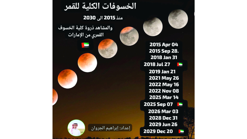 وقال رئيس مجلس إدارة جمعية الإمارات للفلك، عضو الاتحاد العربي لعلوم الفضاء والفلك، إبراهيم الجروان، إن الخسوف هو أول خسوف كلي للقمر تشهده الإمارات منذ نحو سبع سنوات، أي منذ الخسوف الكلي للقمر الذي شهدته صيف 2018، مشيراً إلى أن الخسوف الكلي الذي سيليه وستشهده الإمارات سيكون شتاء 2029.