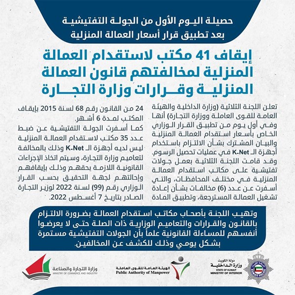 كما أسفرت الجولة التفتيشية عن ضبط عدد 35 مكتبا لاستقدام العمالة المنزلية ليس لديه أجهزة الـ K-Net وذلك بالمخالفة لتعاميم وزارة التجارة، وسيتم اتخاذ الاجراءات القانونية اللازمة بحقهم، وذلك بإيقافهم وإحالتهم لجهة التحقيق بحسب القرار الوزاري رقم 99 لسنة 2022 لوزير التجارة الصادر بتاريخ 7 أغسطس 2022.