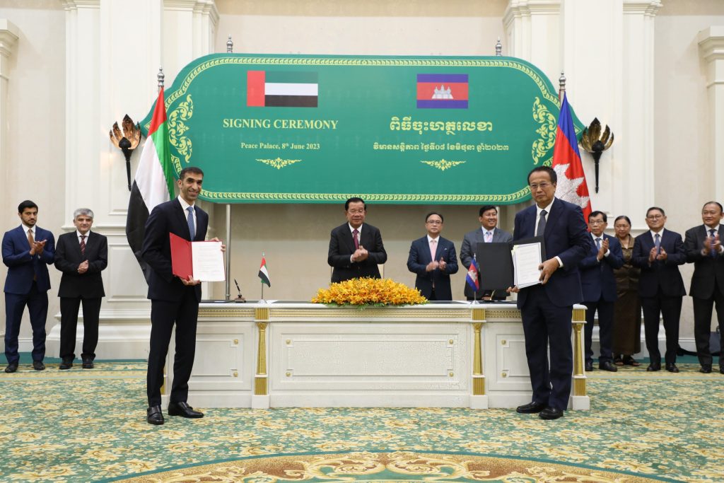 وتعدّ اتفاقية الشراكة الاقتصادية الشاملة بين الإمارات وكمبوديا، الخامسة التي تدخل حيز التنفيذ، وتستهدف زيادة القيمة الإجمالية للتجارة غير النفطية بين الدولتين إلى مليار دولار سنوياً بحلول عام 2030.