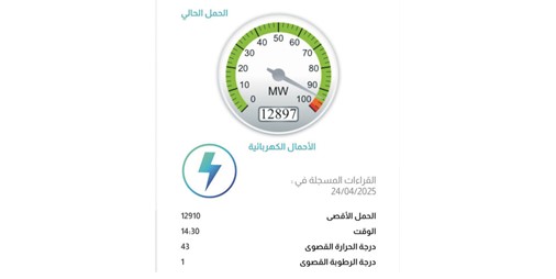 ادى ارتفاع درجات الحرارة أمس إلى ارتفاع نسب الاستهلاك الكهربائي مقارنة بأمس الأول حيث بلغ الحمل الاقصى أمس 12910 ميغاواط مقتربا من المنطقة الحمراء.