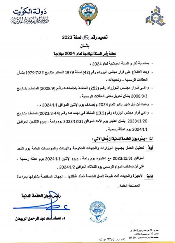 عمم ديوان الخدمة المدنية عطلة رأس السنة الميلادية 2024. وجاء في التعميم أن الأحد 31 ديسمبر يوم راحة والإثنين 1 يناير عطلة رسمية والدوام 2 من الشهر ذاته .
