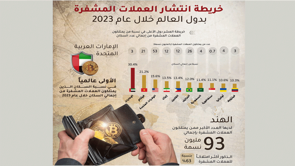 أفاد مركز «إنترريجونال للتحليلات الاستراتيجية» في أبوظبي بأن دولة الإمارات تصدرت دول العالم من حيث نسبة ممتلكي العملات المشفرة من إجمالي السكان بنسبة 30.4%. وبلغ حجم سوق العملات المشفرة في العالم نحو 41 مليار دولار خلال 2023، فيما يتوقع أن يصل إلى 71.7 مليار دولار 2024، وفقاً لمؤسسة «ستاتيستا – statista».