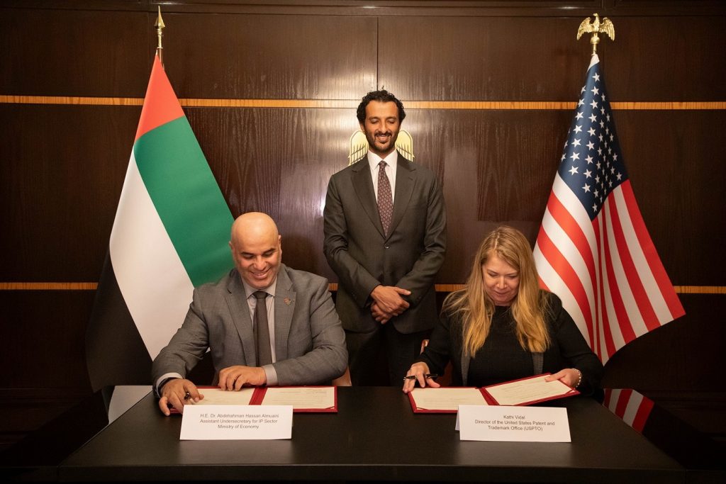 وقَّعت دولة الإمارات العربية المتحدة مذكرة تفاهم مع الولايات المتحدة الأمريكية اليوم، لتعزيز التعاون في تطبيقات حماية حقوق الملكية الفكرية، وتوفير إطار عام وتقنية مرنة لاستكشاف وتعزيز الأنشطة الإبداعية والابتكارية وتطوير سياسات جديدة للملكية الفكرية وأنظمتها وحمايتها، بما يسهم في تعزيز نمو واستدامة اقتصاد البلدين الصديقين.