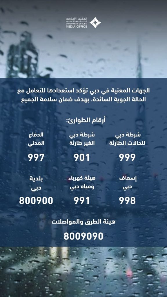 نشر المكتب الإعلامي لحكومة دبي عبر حسابه الرسمي بموقع التواصل الإجتماعي “X”، “تويتر” سابقاً، أرقام الجهات المعنية في دبي تؤكد استعدادها للتعامل مع الحالة الجوية السائدة، بهدف ضمان سلامة الجميع.