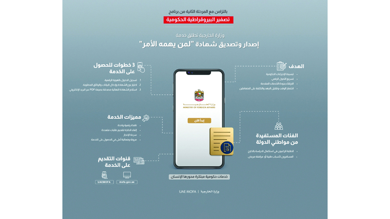 أطلقت وزارة الخارجية خدمة رقمية جديدة بهدف إصدار وتصديق شهادة «لمن يهمه الأمر»، بالتزامن مع المرحلة الثانية من برنامج «تصفير البيروقراطية الحكومية»، وتماشياً مع جهود دولة الإمارات في تطوير الخدمات الحكومية بحيث يمكن إنجاز المعاملة بثلاث خطوات فقط عبر نافذة رقمية واحدة، ودون الحاجة إلى زيارة مقر البعثة.