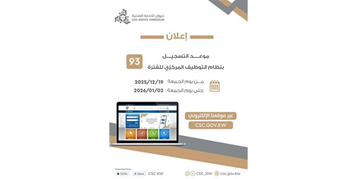 شاركها فيسبوك تويتر لينكدإن بينتيريست تيلقرام البريد الإلكتروني مريم بندق أعلن ديوان الخدمة المدنية، رسميا أن موعد تسجيل الباحثين عن عمل بنظام التوظيف المركزي، للفترة 93 سيكون اعتبارا من يوم الجمعة الموافق 19 الجاري إلى يوم الجمعة الموافق 2 يناير المقبل.