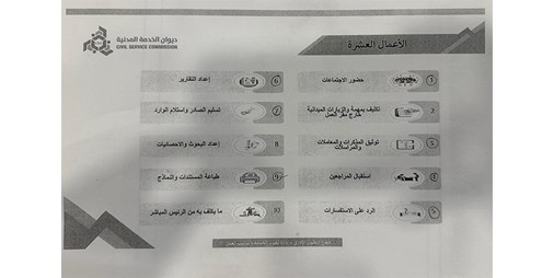 واشتملت المهام الـ10 على إنجاز الموظف ما يكلفه به الرئيس المباشر، طباعة المستندات والنماذج، إعداد البحوث والاحصائيات، تسليم الصادر واستلام الوارد، إعداد التقارير، الرد على الاستفسارات، استقبال المراجعين، توثيق المذكرات والمعاملات والمراسلات وحضور الاجتماعات.