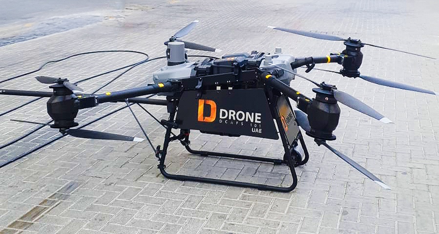 وأوضح أنه يمكن تشغيل الدرون الذي يزن 27 كيلوجراماً بواسطة البطارية أو بالكهرباء، ويمكن أن يعمل لمدة 12 ساعة متواصلة، لافتاً إلى أنه مجهز بأضواء ليلية، وأجهزة استشعار للحرارة ونظام مظلات للهبوط الاضطراري في حالة تعطله مما يمنع الدرون من الاصطدام بالأرض.