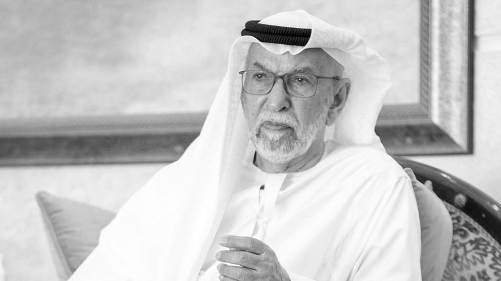 الشيوخ والجموع يؤدون صلاة الجنازة على جثمان حمد الخييلي في مدينة العين