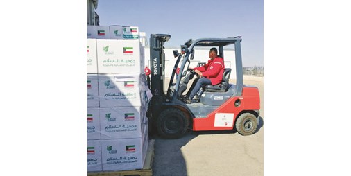وصلت أمس الثلاثاء الطائرة الإغاثية الـ 14 من الجسر الجوي الكويتي إلى مطار دمشق الدولي بحمولة 40 طنا من المواد الغذائية والإيوائية ضمن حملة «الكويت بجانبكم». وتأتي هذه الحملة بتنظيم جمعية السلام للأعمال الإنسانية والخيرية وتعاون وزارات الشؤون والخارجية والدفاع ممثلة بالقوة الجوية الكويتية. وتتضمن المساعدات مجموعة من المواد الغذائية طويلة الأمد إلى جانب مستلزمات الشتاء من بطانيات وأقمشة ثقيلة وقفازات وغيرها فضلا عن سيارات إسعاف لدعم القطاع الصحي وكراسي متحركة لذوي الإعاقة.