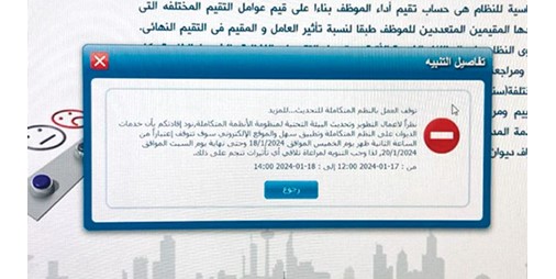 وقالت الوزارة: نظرا لأعمال التطوير وتحديث البيئة التحتية لمنظومة الأنظمة المتكاملة، نود إفادتكم بأن خدمات الديوان على النظم المتكاملة وتطبيق «سهل» والموقع الإلكتروني ستتوقف اعتبارا من الساعة الثانية ظهر الخميس حتى نهاية يوم السبت 20 يناير، لذا وجب التنويه لمراعاة أي تأثيرات تنجم عن ذلك.
