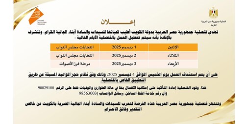 تهدي قنصلية جمهورية مصر العربية بالكويت أطيب تحياتها لأبناء الجالية، وتتشرف بالإفادة بأنه سيتم تعطيل العمل بالقنصلية الأيام التالية: