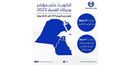 شاركها فيسبوك تويتر لينكدإن بينتيريست تيلقرام البريد الإلكتروني حنان عبد المعبود أعلنت هيئة مكافحة الفساد “نزاهة”، عن ارتفاع الكويت 14 مركزاً في الترتيب العالمي لمؤشر مدركات الفساد العالمي لعام 2023 ،مبينة أنها قفزت من المركز 77 إلى المركز 63 دولياً، حيث تتقدم 4 درجات في مؤشر مدركات الفساد العالمي.