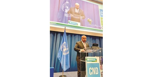 كما شدد السفير الفصام على ضرورة الالتزام الكامل بمضمون الاتفاقيات الدولية الثلاث للمخدرات باعتبارها حجر الزاوية في التصدي لمشكلة المخدرات العالمية.