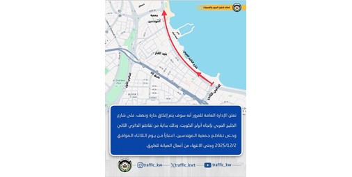 أعلنت الإدارة العامة للمرور أنه سيتم إغلاق حارة ونصف على شارع الخليج العربي باتجاه أبراج الكويت، وذلك ابتداءً من اليوم الثلاثاء الموافق 2 ديسمبر الجاري، من تقاطع الدائري الثاني حتى تقاطع جمعية المهندسين.