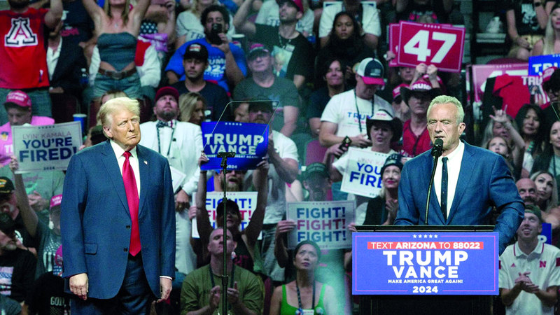 وبعد أن أفادت منشورات متعددة أنه يخطط للانسحاب، وأنه في مناقشات لدعم ترامب، انضم المرشح الرئاسي المستقل روبرت كينيدي الابن إلى الرئيس الأميركي السابق، دونالد ترامب، على منصة تجمع انتخابي في أريزونا، الجمعة، وأدلى بكلمة أبرز فيها عدداً من النقاط عقب لقاءات جمعتهما، أخيراً.