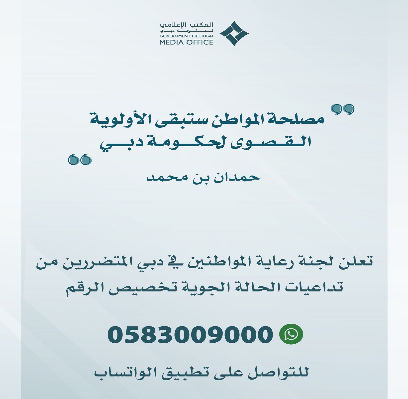 تخصيص رقم على تطبيق “واتساب” لاستقبال طلبات الدعم من المواطنين المتضررين في دبي من الأحوال الجوية الأخيرة