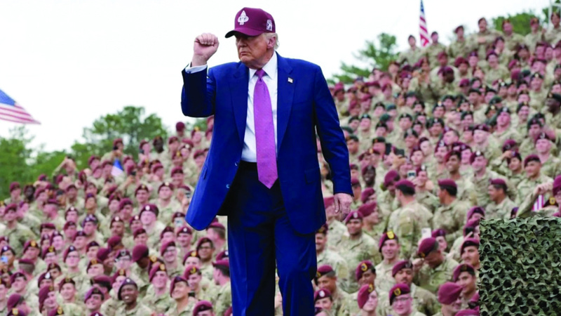 وخلال الشهر ذاته زار الرئيس ترامب منشأة «فورت براغ» العسكرية في ولاية كارولينا الشمالية للاحتفال بمرور 250 عاماً على تأسيس الجيش، وقام بتحويل المناسبة إلى حشد سياسي عن طريق تحريض الجنود الذين يرتدون بدلات رسمية على دعم تعليقاته الحزبية.