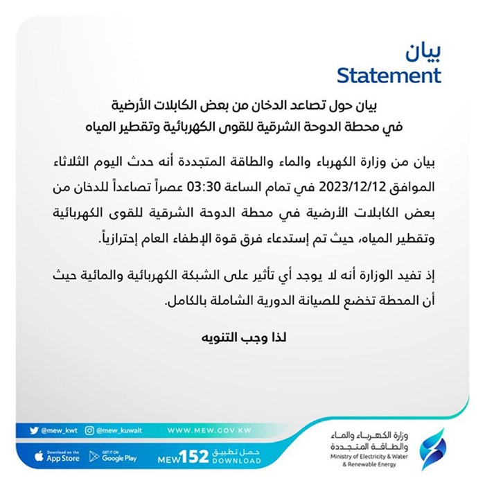 أصدرت وزارة الكهرباء والماء والطاقة المتجددة بيانا أوضحت فيه أسباب تصاعد الدخان من بعض الكيبلات الأرضية في محطة الدوحة الشرقية، لافتة الى ان المحطة تخضع حاليا للصيانة الدورية الشاملة، ومشيرة الى انه تم استدعاء الاطفاء احترازيا، إذ لم يؤثر ذلك على سلامة الشبكة.