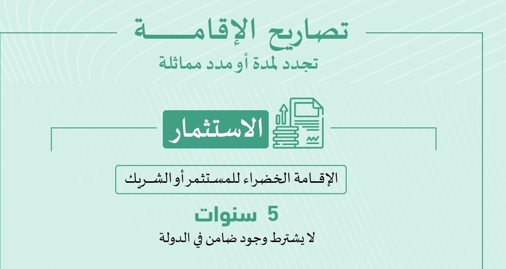وذكرت ضمن تقرير لها أنه تم استحداث الإقامة الخضراء للمستثمر أو الشريك في نشاط تجاري بدون ضامن ولمدة 5 سنوات قابلة للتجديد لتحل محل إقامة المستثمر السابقة التي كانت مدتها سنتان وباشتراطات أبسط ومزايا أكبر.