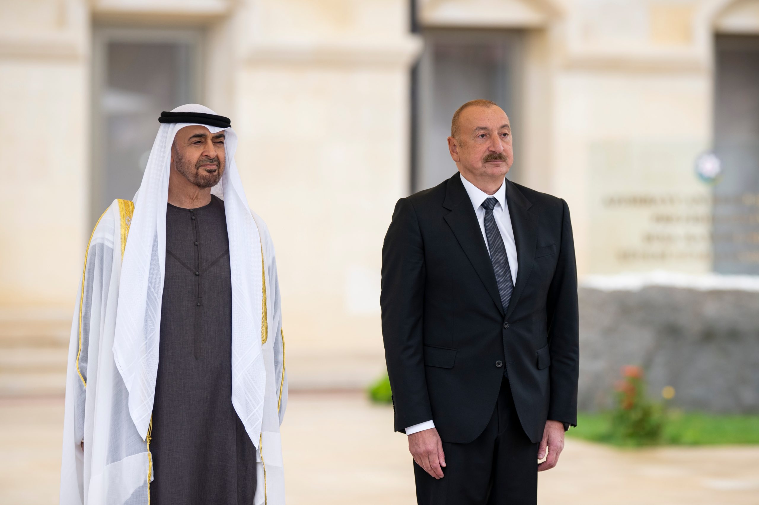 وجرت لسموه في الساحة الخارجية مراسم استقبال رسمية حيث عزف السلام الوطني لكل من دولة الإمارات وأذربيجان، واستعرض سموه ثلة من حرس الشرف اصطفت تحية لسموه.