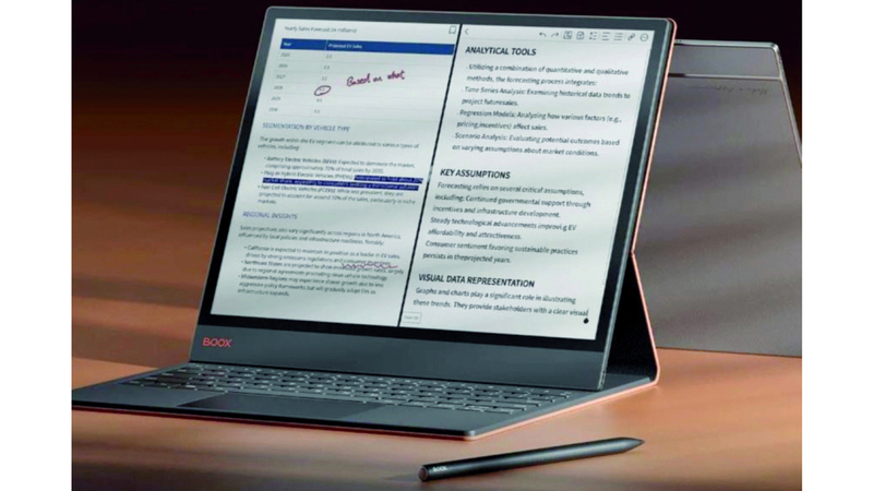 وأوضحت الشركة الصينية أن حاسوبها «Boox Tab X C» الجديد، يأتي بشاشة «E Ink Kaleido 3» قياس 13.3 بوصة، وبدقة وضوح تبلغ (1600 × 1200 بيكسل) عند عرض المحتويات بالألوان، وبدقة وضوح تبلغ (3200 × 2400 بيكسل) عند عرض المحتويات بالأبيض والأسود، مع إمكانية الاستعمال بوساطة قلم الإدخال «InkSpire».