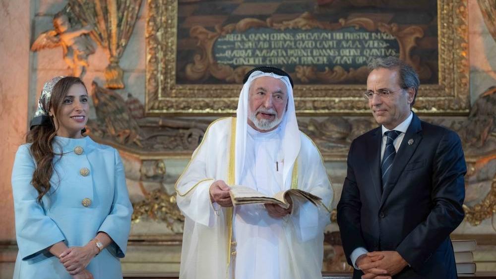 بدوره ألقى أميلكار فالكاوم، رئيس جامعة كويمبرا كلمة استذكر فيها مَنْح الجامعة صاحب السمو حاكم الشارقة درجة الدكتوراه الفخرية في العام 2018م والذي شكل علامة على التقارب بين البرتغال وإمارة الشارقة، موضحاً الحرص الكبير الذي ظهر من قبل الطرفين لبناء علاقات راسخة ومستدامة، ووجدت هذه العلاقات في الثقافة أرضاً خصبة للتلاقي والحوار وبناء المستقبل، حيث بادر سموه خلال زيارته السابقة لمكتبة جوانينا عن رغبته بتطوير مشروع مشترك لرقمنة مجموعة من كتبها القيمة.