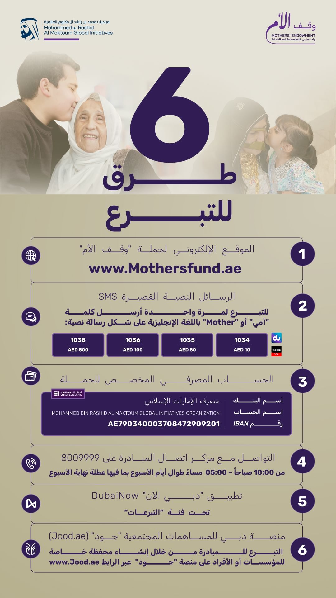أعلنت حملة “وقف الأم”، التي أطلقها صاحب السمو الشيخ محمد بن راشد آل مكتوم نائب رئيس الدولة رئيس مجلس الوزراء حاكم دبي “رعاه الله”، تخصيص 6 قنوات ميسّرة لاستقبال تبرعات وإسهامات الأفراد والمؤسسات، للمساهمة في تكريم الأمهات من خلال إنشاء صندوق وقفي لتوفير التعليم لملايين الأفراد حول العالم بشكل مستدام.