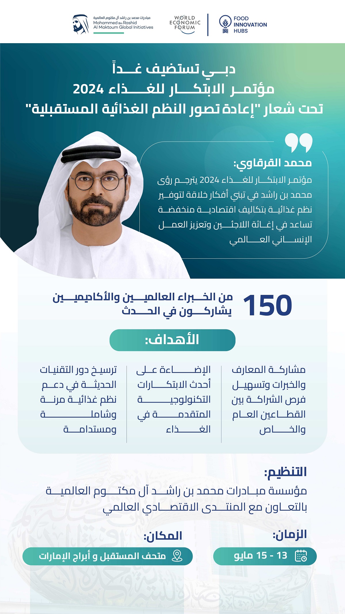 ويشهد المؤتمر عقد اجتماع لمراكز الابتكار الغذائي يوم الثلاثاء 14 مايو، والذي يأتي بموجب الاتفاق الذي أبرمته مؤسسة مبادرات محمد بن راشد آل مكتوم العالمية مع المنتدى الاقتصادي العالمي في دافوس 2022، ويقضي بجعل دبي المقر الدولي لانعقاد الاجتماع السنوي للمراكز.