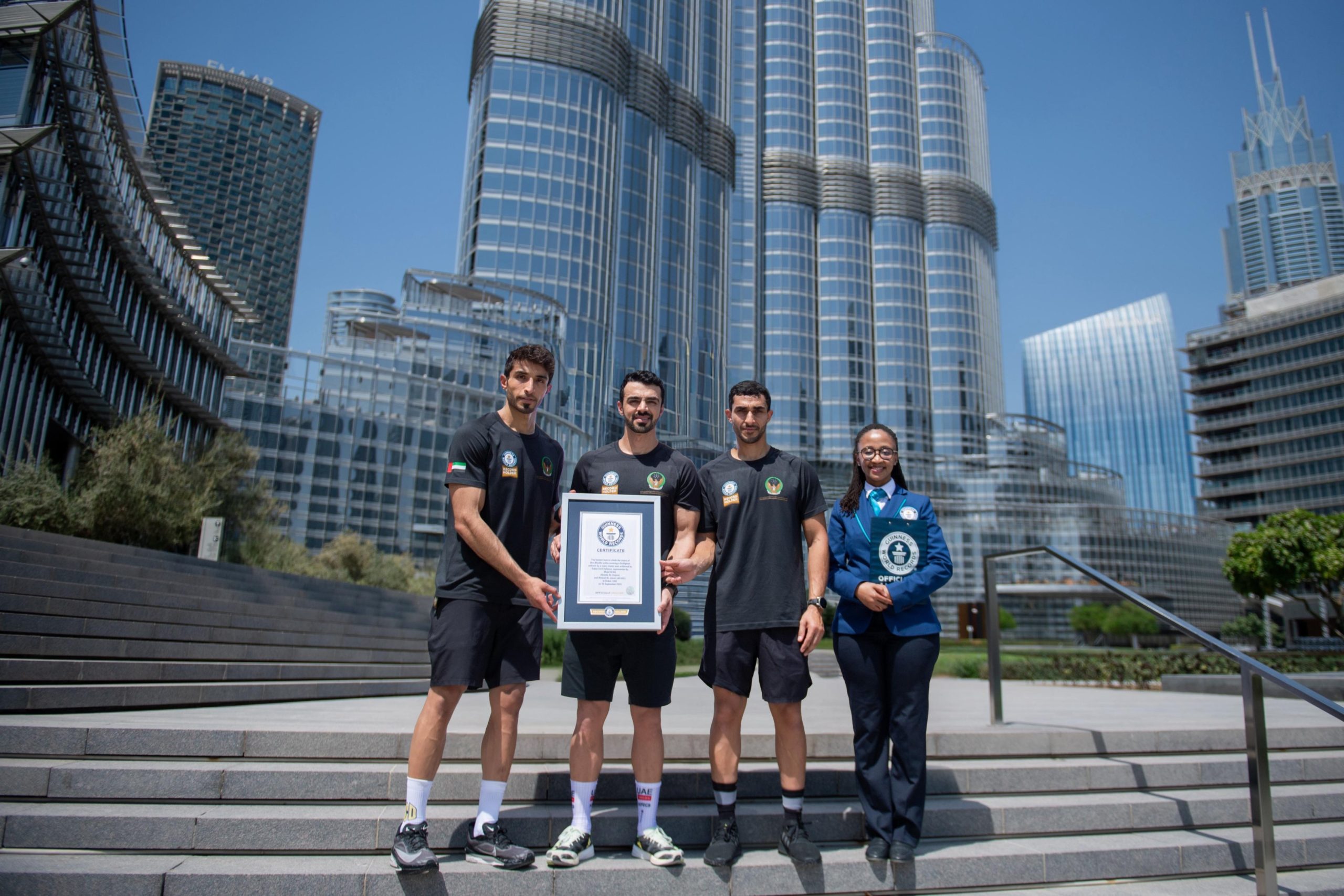 سجلت القيادة العامة للدفاع المدني في دبي إنجازاً عالمياً بإدراجها في موسوعة غينيس للأرقام القياسية، بعد أن حقق فريق من رجال الدفاع المدني رقم قياسي بلغ 52 دقيقة 30 ثانية، أسرع زمن لصعود برج خليفة (أطول برج في العالم) الذي يتكون من 159 طابق عبر السلالم، مع ارتداء الزي الكامل لبدلة الإطفاء التي بلغ وزنها الإجمالي مع إسطوانة الأوكسجين 15 كيلو غرام.