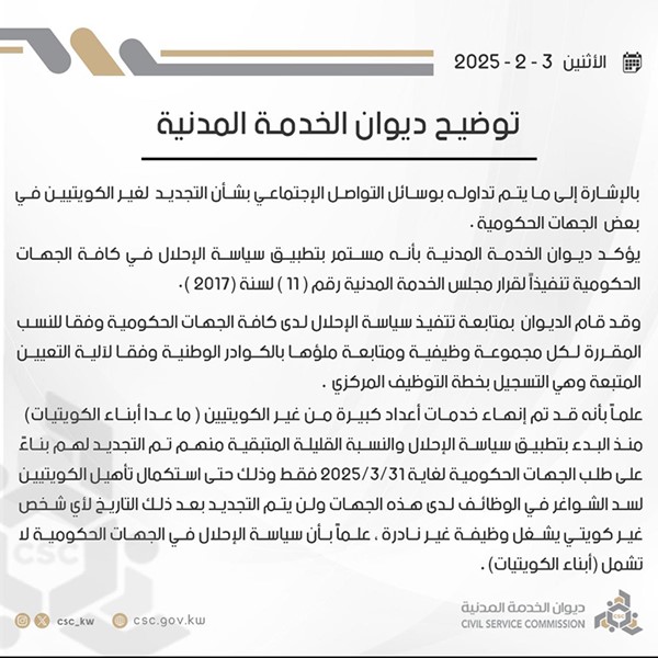 هذا ،وتضمن بيان الديوان استمراره في تطبيق سياسة الإحلال في الجهات الحكومية كافة والتي “لا تشمل أبناء الكويتيات”.