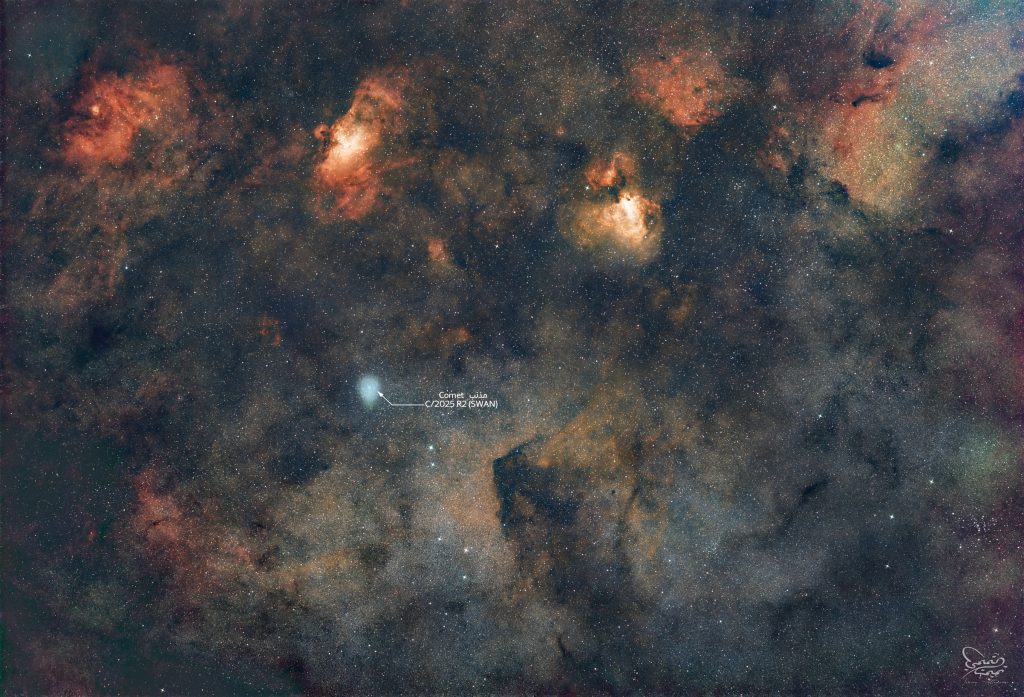 رصدت جمعية الإمارات للفلك المذنب C/2025 R2 (SWAN)، الزائر القادم من أطراف النظام الشمسي، وذلك خلال مروره في موقع مميز بسماء الدولة يوم 18 أكتوبر الجاري.