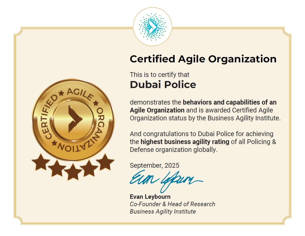 حصلت القيادة العامة لشرطة دبي على اعتماد المعهد العالمي للرشاقة المؤسسية “Business Agility Institute – BAI” كأفضل جهة شرطية في مجال الرشاقة المؤسسية على مستوى العالم، وذلك بعد عملية تقييم شاملة استهدفت قدرات القيادة المؤسسية ونضج منظومة الرشاقة.